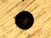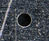- 実体顕微鏡で穴を観察。穴の形が円から変形している時はW線の先端を観察して、必要なら少し削る。