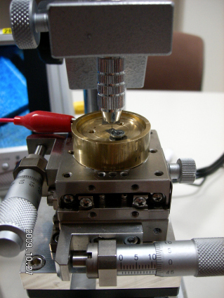 - XYステージ軸で加工位置を適当に設定する。仮押ししたガスケットの場合は、顕微カメラで2方向から見て、ガスケット凹部の中心にW線先端が来るようにXY軸を調整し、ロックする。Z軸を変えて、W線先端と板が接触する位置のZ値をメモしておく(後で加工液を入れると接触する位置がわかりづらいため)。