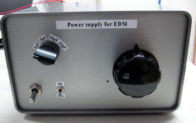 回路部分は前に作った溶接機とほぼ同じで、AC100Vを可変トランス(スライダック)に通して、ダイオードブリッジで全波整流し、容量の大きい電解コンデンサーで平滑化する。溶接機の場合はここでおしまいであるが、放電加工機ではその先に数キロオームの抵抗と数nFのコンデンサー(いくつか選択できるようにしておく)が接続される。ここはいわゆるRC回路で、充電と放電を周期的に繰り返す働きをする。抵抗は放電の周期を、コンデンサーは放電で放出されるエネルギーを決めている。コンデンサー容量が小さいほど、放電のエネルギーは小さくなり、加工速度は遅いが、加工が丁寧になる。抵抗は2k、4kオームをスイッチで、コンデンサーは0.3, 1, 3, 10nFをロータリースイッチで選択できるようにしている。下の写真は電源部である。写真のつまみに書いているpFはnFの間違い。電源部のみは3万円以下でできる。このスライダックは絶縁タイプではないので、感電に注意。