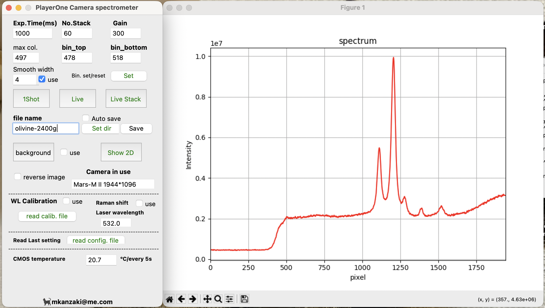 下は2秒露光のCMOS画面。中央から少し左の明るい2点がオリビンの2つの強いピークに対応してます。右端の縦長の部分がレーザー(0 cm-1)によるもので、その付近が暗いのはラマンエッジフィルターによる減光のため。2つのピークの分離が前より悪いのは回折格子を変えているためで倍の波数領域が見えてます。Windows上のSharpCapで画像を取得してます。SharpCapにはMac版がないのですが、AstroDMx CaptureにはMac版もあって、これを使うとMacからもラマンピークを見ることができました。今回はフィルター類は本格的なもの(Semrockの532 nm用ラマンエッジフィルター、ダイクロイックフィルター)を使ってます。