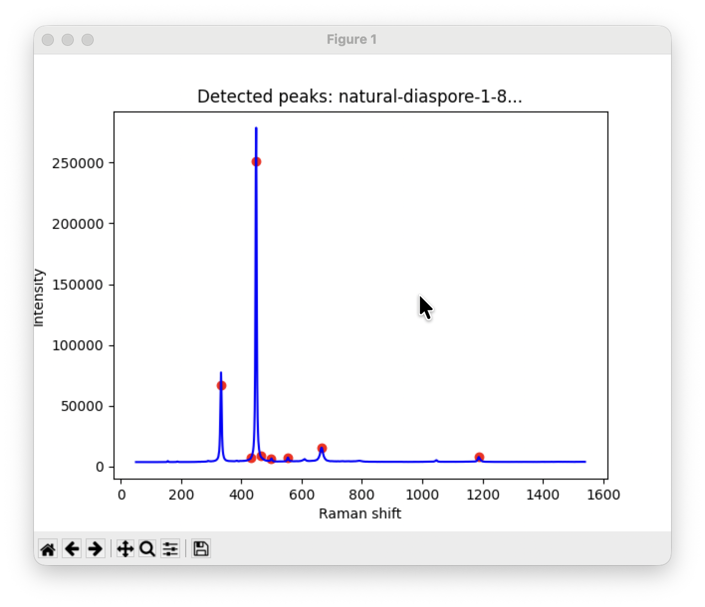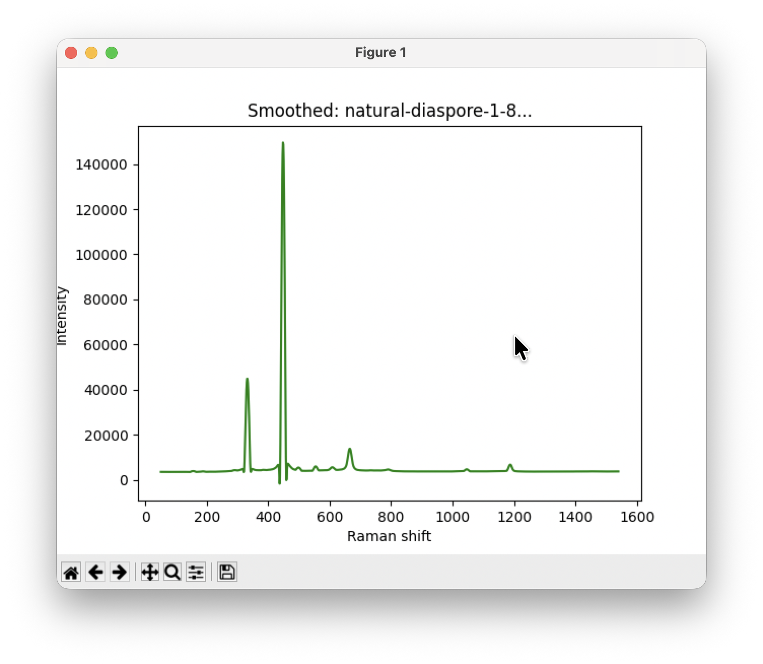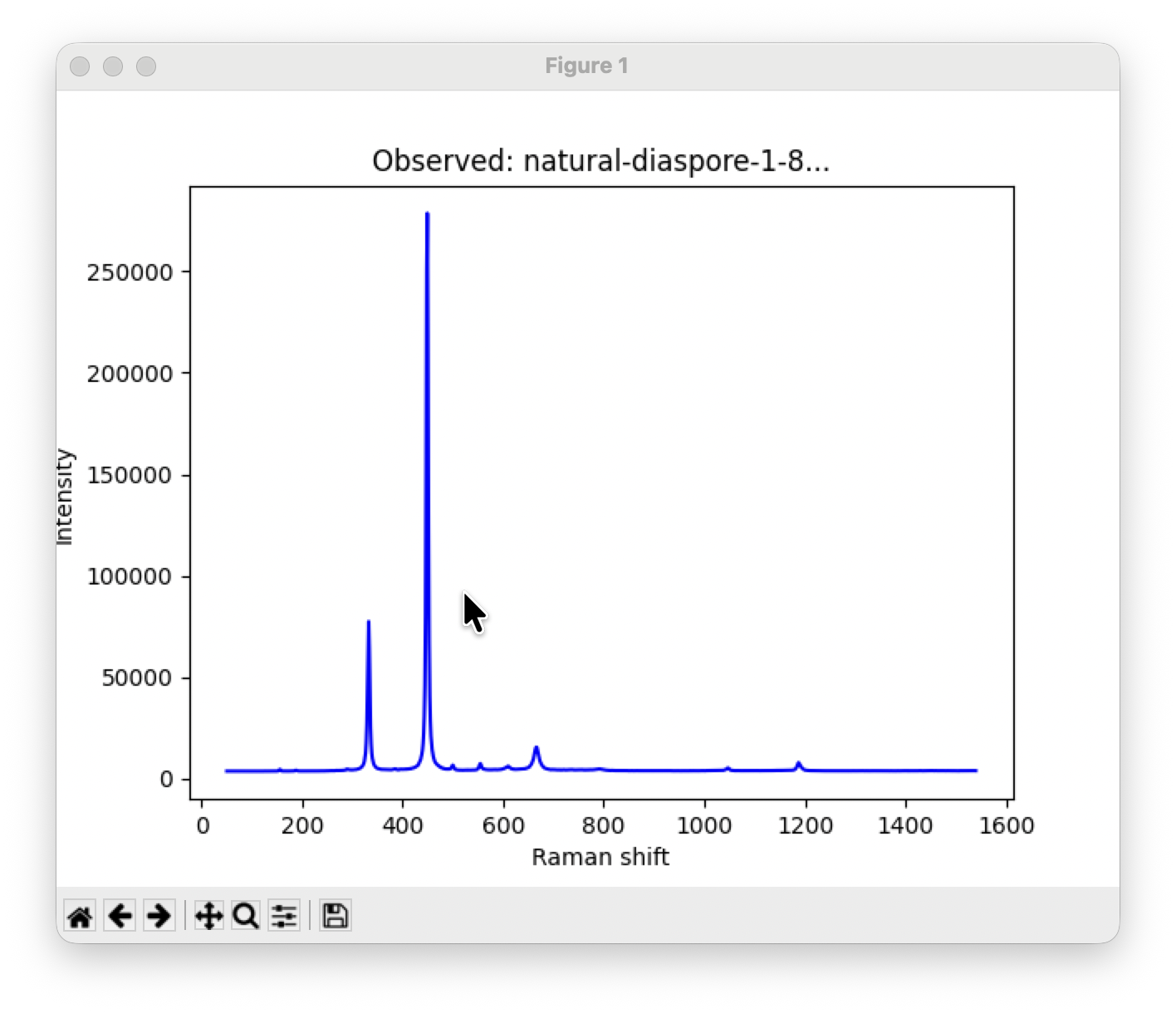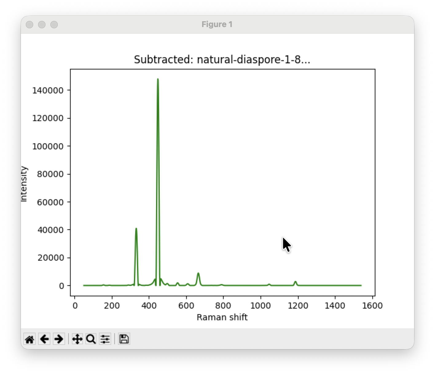 まずはLoadボタンをクリックして、データを読み込みます。例は天然ダイアスポアのスペクトルです。読み込むとMatPlotLibを使ってスペクトルを表示します。