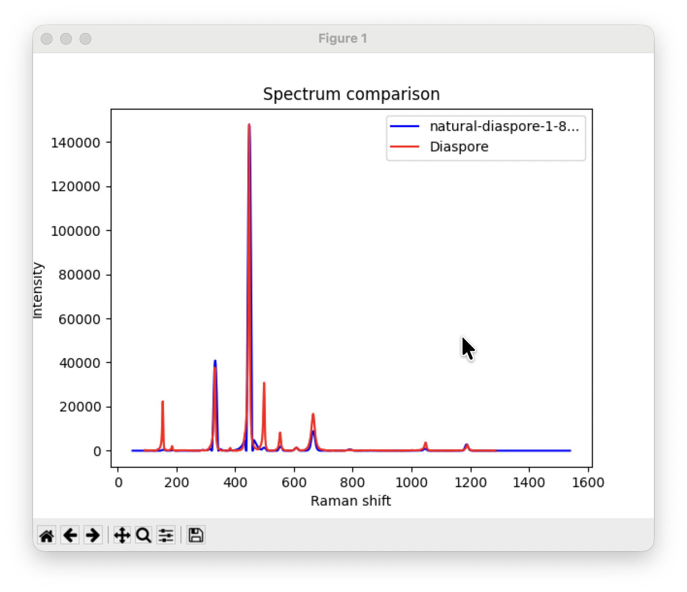 このリストボックスから見たいものを選んでPlotボタンをクリックするとそのスペクトルと測定されたスペクトルが同時に表示されるので、2つが一致しているかどうかを判断できます。また隣のOpenボタンをクリックするとテキストエディタでデータファイルが開きます(なおこれ直近で付けたので上の図ではOpenボタンがまだありません)。その試料の細かい情報がデータファイルのヘッダ部分にあります。この例の場合は候補にはダイアスポアだけがリストされており、そのスペクトルをプロットすると測定スペクトルとよく一致していることが分かりますので、ダイアスポアと同定できます。