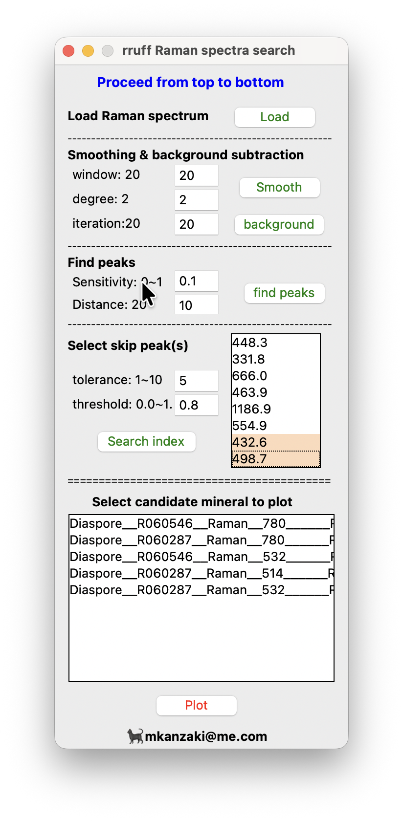 リストボックスのピークリストを吟味して、本来のピークでないものがあった場合(例えば宇宙線由来ピーク)はリストボックスのその行をクリックすると選択されます。選択されたものは検索で使いません。下の例では2つを除外してます。それでSearch indexボタンをクリックすると検索が始まって、一致のよい候補を一番下のリストボックスに表示します。より多くの候補を見たい場合はthresholdを小さくしてください。測定データが波数校正してない場合はtoleranceを少し大きくした方がいいかもしれません。なお、RRUFFのデータは約50から100 cm-1以下の低波数データがないので、測定スペクトルがレイリー散乱やantistokes側を含むものであっても50 cm-1以下は使わないようにしてます。