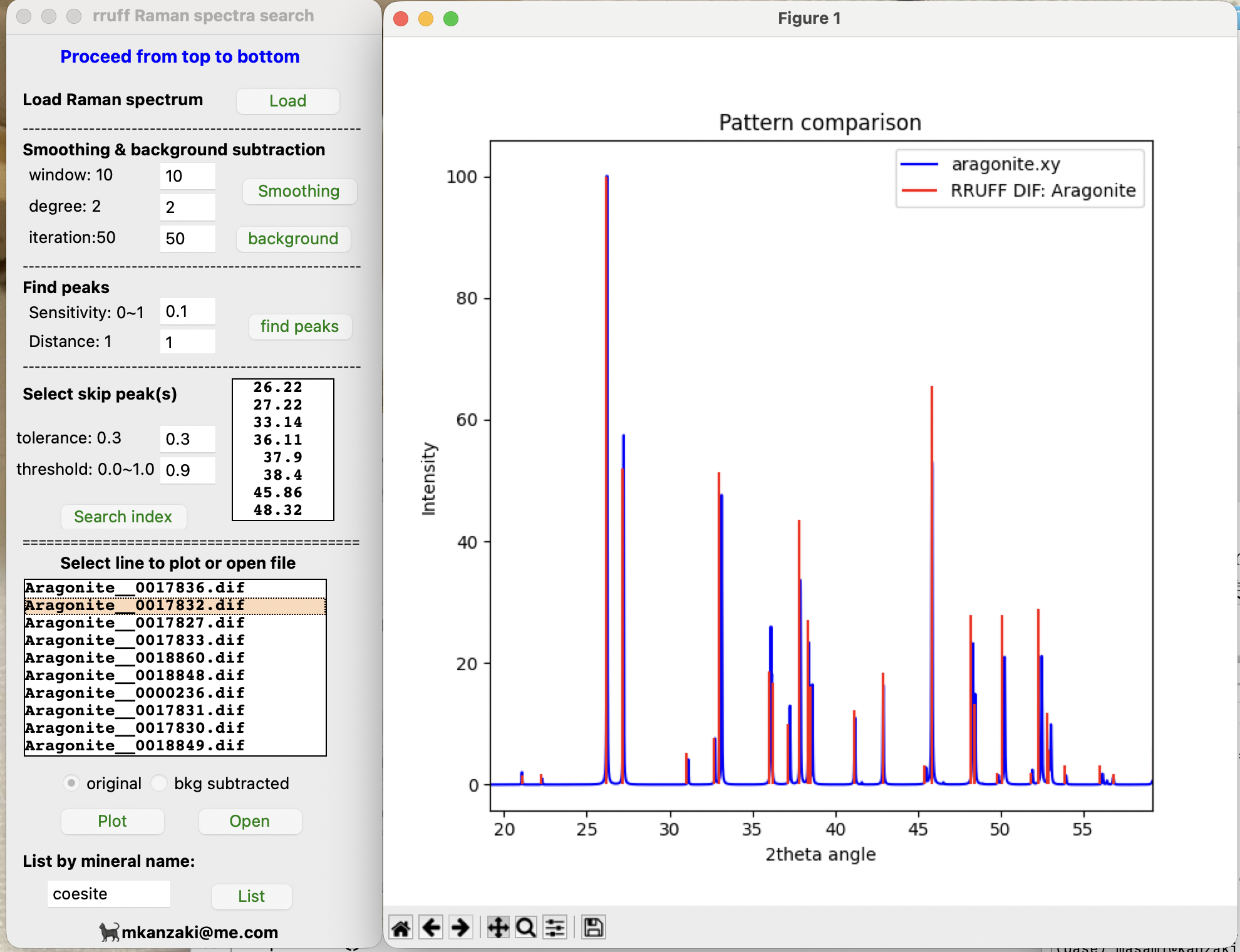 - 別途検索用プログラムを作りました。プログラムではindex_dif.txtを最初に読み込んでおきます。次に同定したい観測粉末回折パターンを読み込んで、プロット、平滑化して、バックグラウンドを取り除いて10個ピーク検出してリストアップします。必要ならそこから使わないピークを選択できます。それをindex_dif.txtファイルと比較して、一致のよいものをリストアップします。リストアップしたものから選択されたものをXY_RAWの回折パターンとして表示して、観察パターンと一致しているかどうかはユーザーが判断します。一致度はポイント制で、強度高いもので一致するとポイントを高くしてます。また、逆にreferenceの強度高いものと一致するかもポイントに使ってます。なので正解ではなくてもピーク数が非常に多い相がリストに出てくることがあります。ここはもう少し改善の余地があると思います。