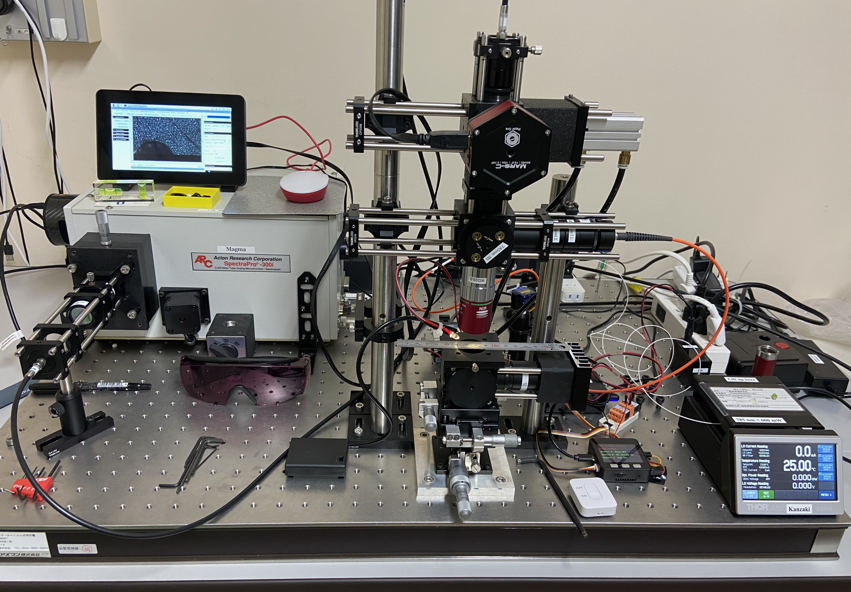 CMOSカメラを使った簡易顕微ラマン分光装置。光ファイバーでSolExPro分光器(右)と繋いでいる。