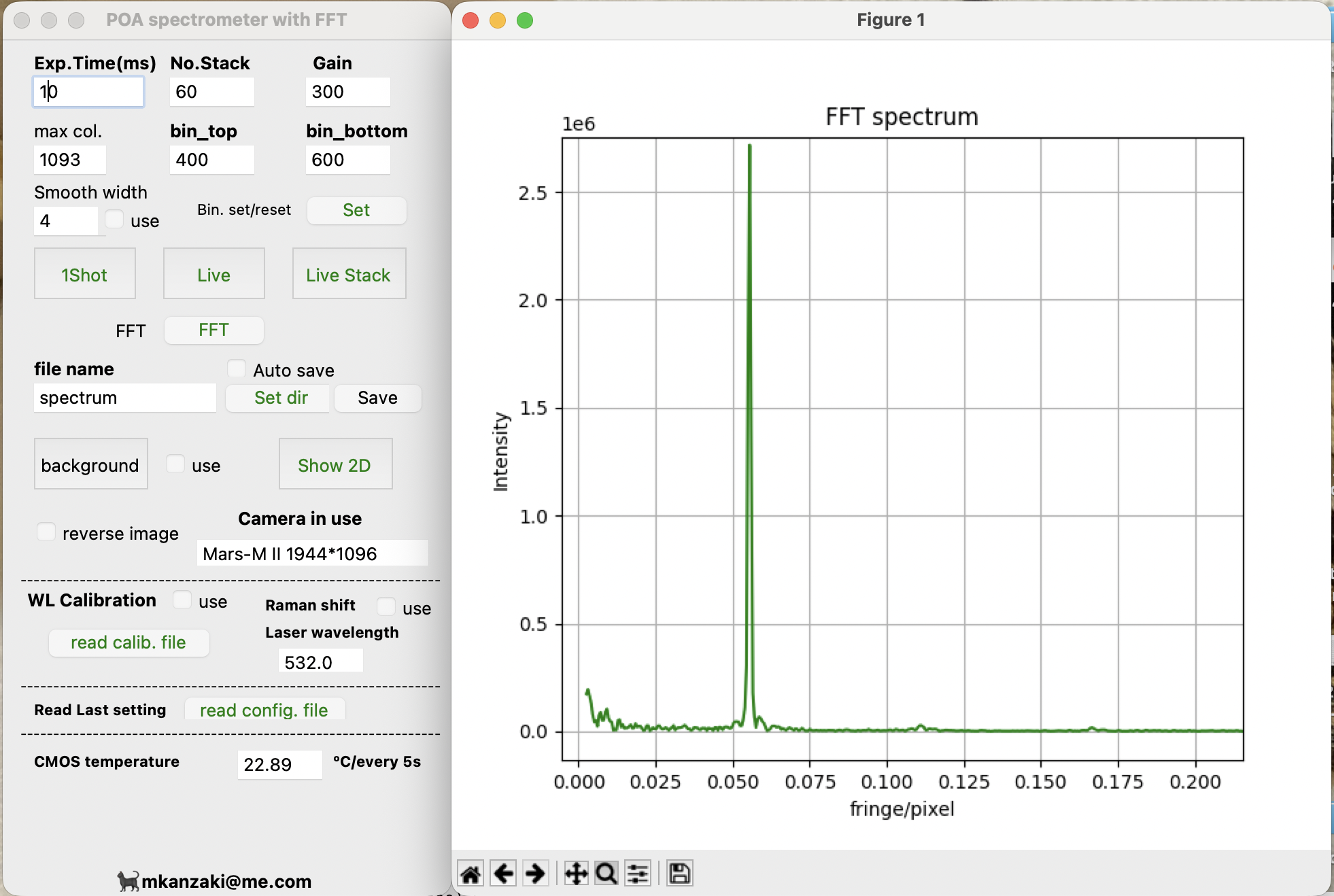 - 1/19 ☀️:空間ヘテロダイン分光器でレーザー光を入れて干渉波形をFFTしてみた。2倍、3倍も見えているが、FFTのせいか?→
